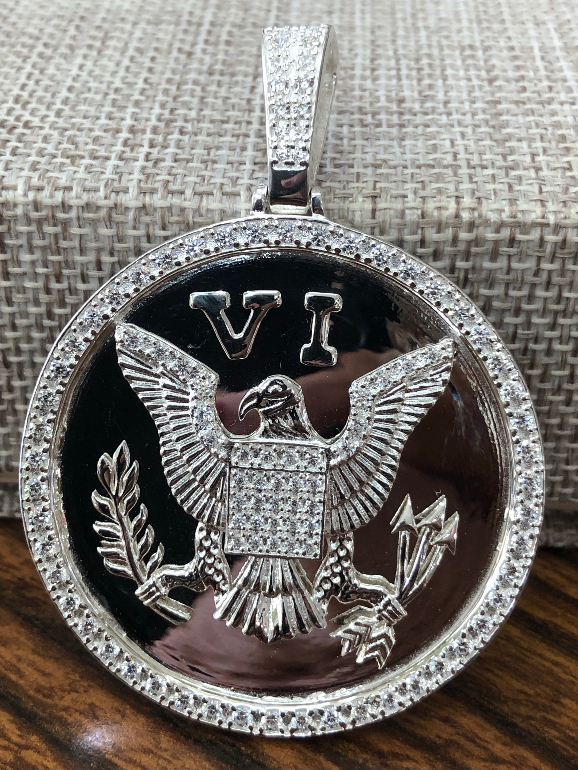 Stunning VI Eagle pendant designed with beautiful stones setting and it’s 3 inches in diameter and weight 27 grams.
